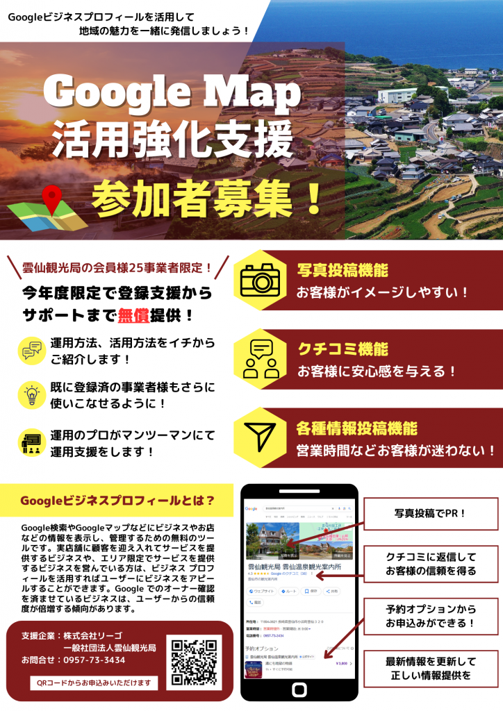 現在雲仙観光局では、今回のセミナーで講師としてご協力いただきました株式会社リーゴ様からの、Googleビジネスプロフィールの運用に関する伴走支援サービスを提供しています。