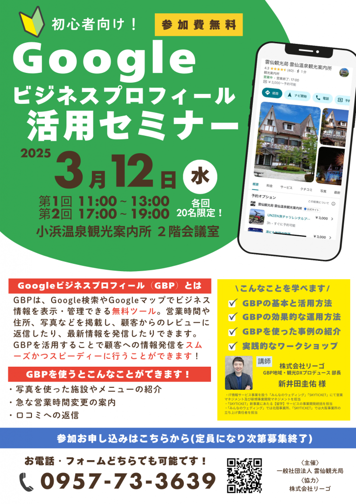 今回のセミナーを通して、参加者の皆様のGBPへの理解と活用意欲が高まったことを大変嬉しく思います。雲仙観光局では、今後も市内事業者様の支援のため、GBPのみならず様々な情報発信やセミナーなどを開催していく予定です。