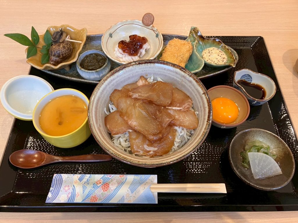 お昼は、新しくできた島のお店で、島の豊かな海産物を使った「寝屋子丼」(漬けヒラメと窯上げシラスのどんぶり)をいただきました。