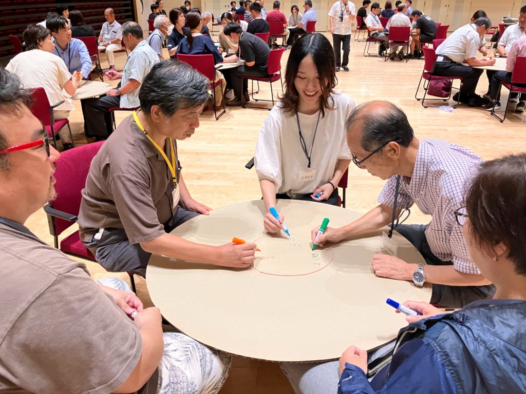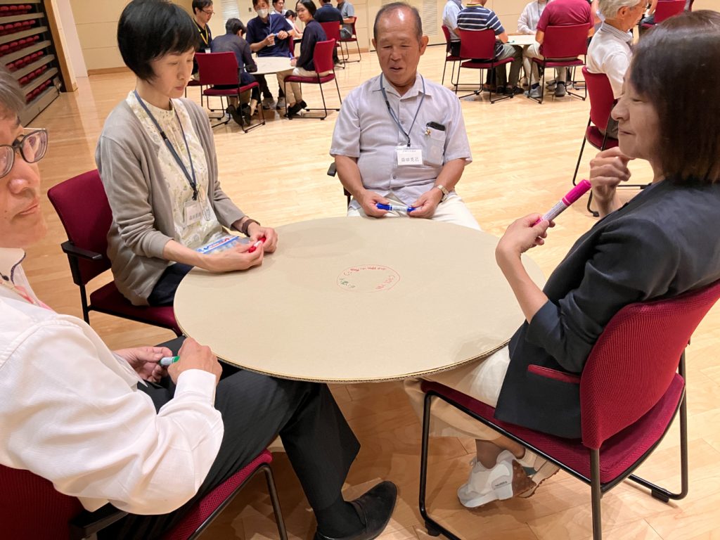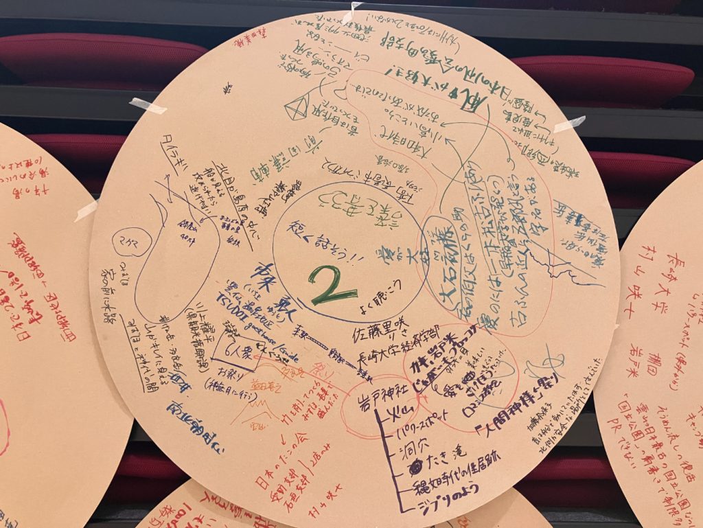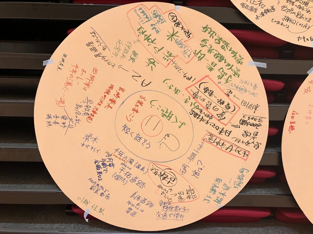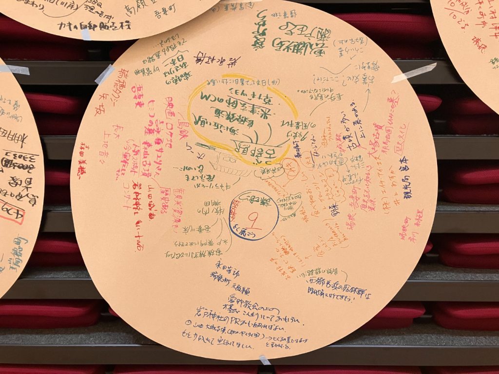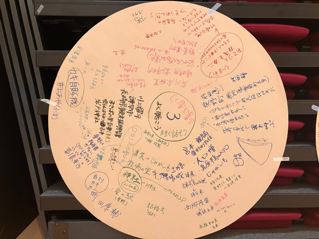 大きな円の段ボールの板とその上に同じ大きさのクラフト紙を置いて、参加者の足で支えてテーブルのようにします。参加者がペンを持ち、「短く話そう、よく聴こう、言葉をかこう」の3つを合言葉に、お喋りをしながら出た話題を紙に書いていくコミュニケーション方法です。どんな人でも楽しく意見が出せるようにと川嶋さんが発明しました。