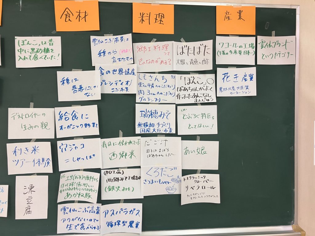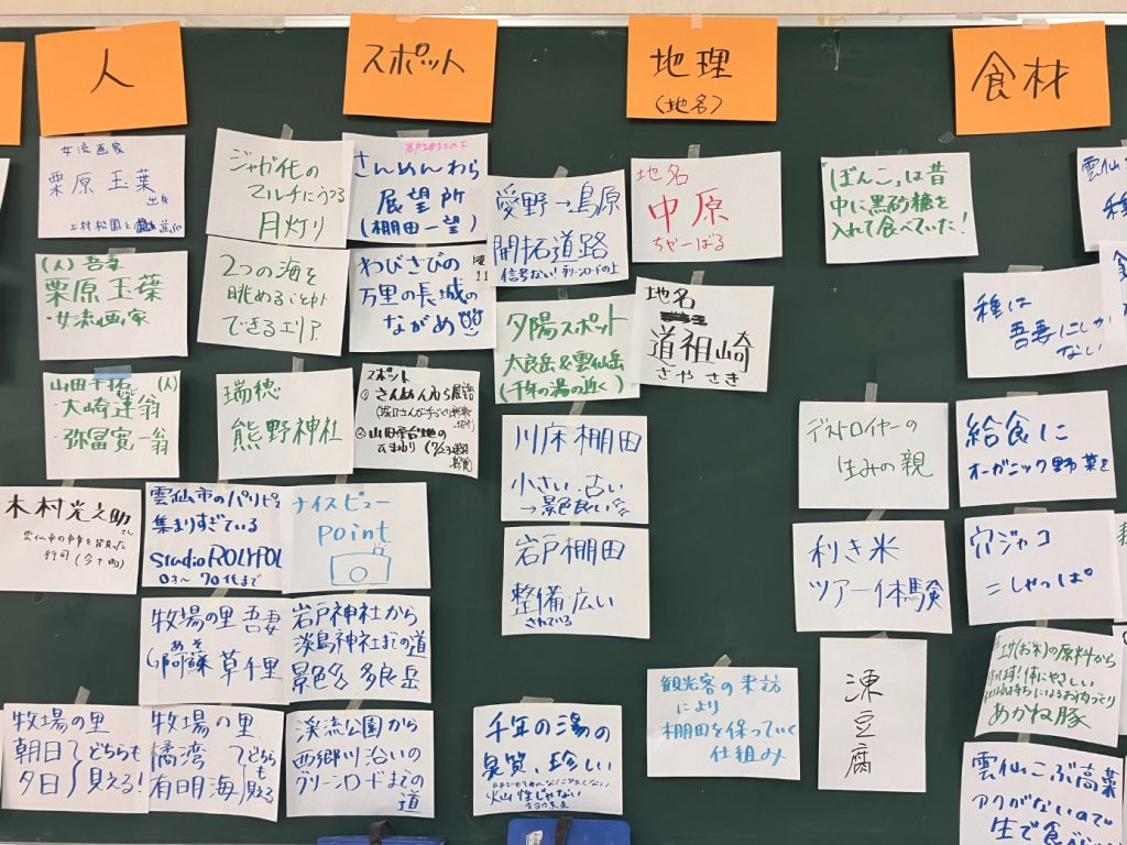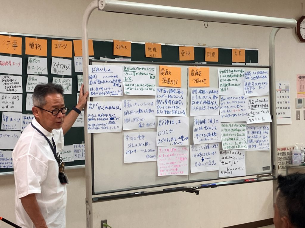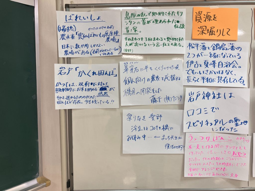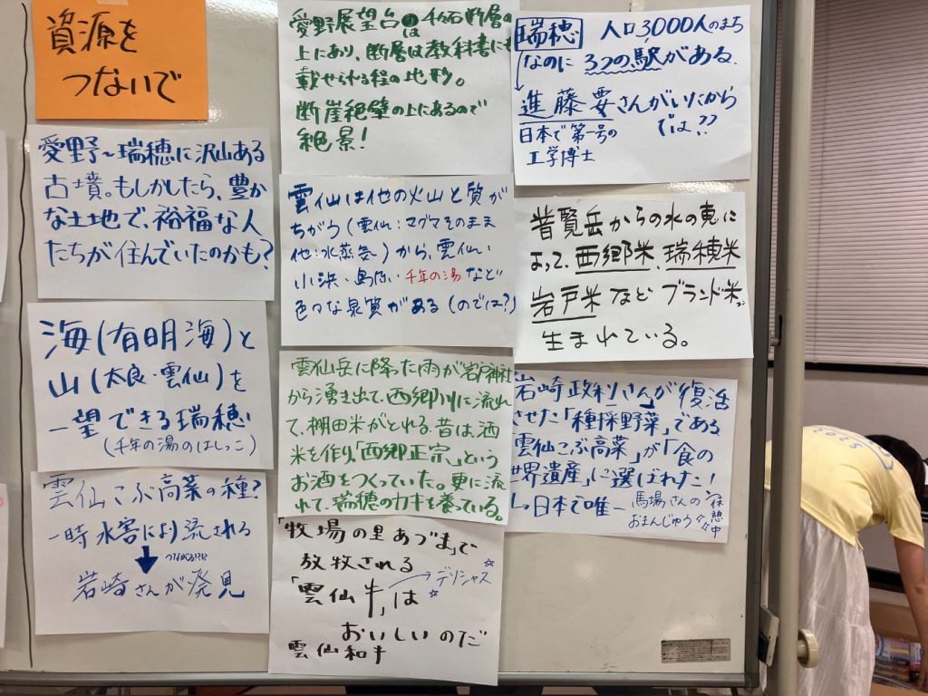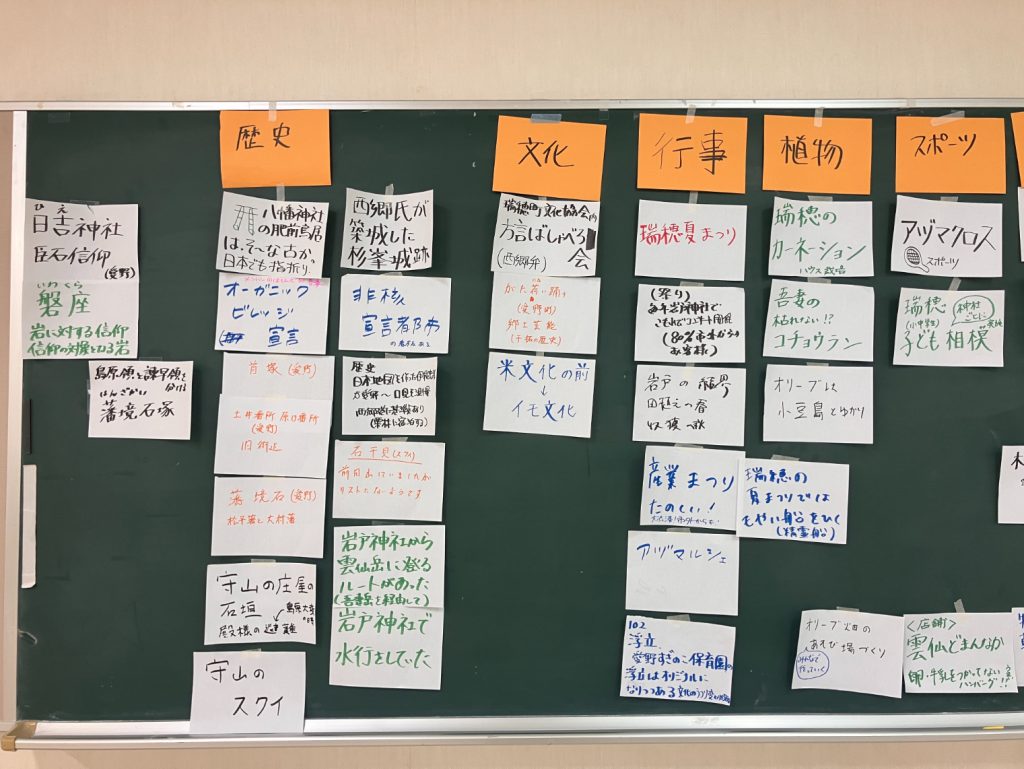 グループ分けを2回行ってじっくり取り組んだ結果、吾妻ならではスポーツや、瑞穂ならでは郷土料理、知られざる愛野の遺跡の話など…多くの資源が出てきました!実際に1次産業に携わっている方も来てくださったので、具体的にどう魅力的なのかを詳しく知ることができました。