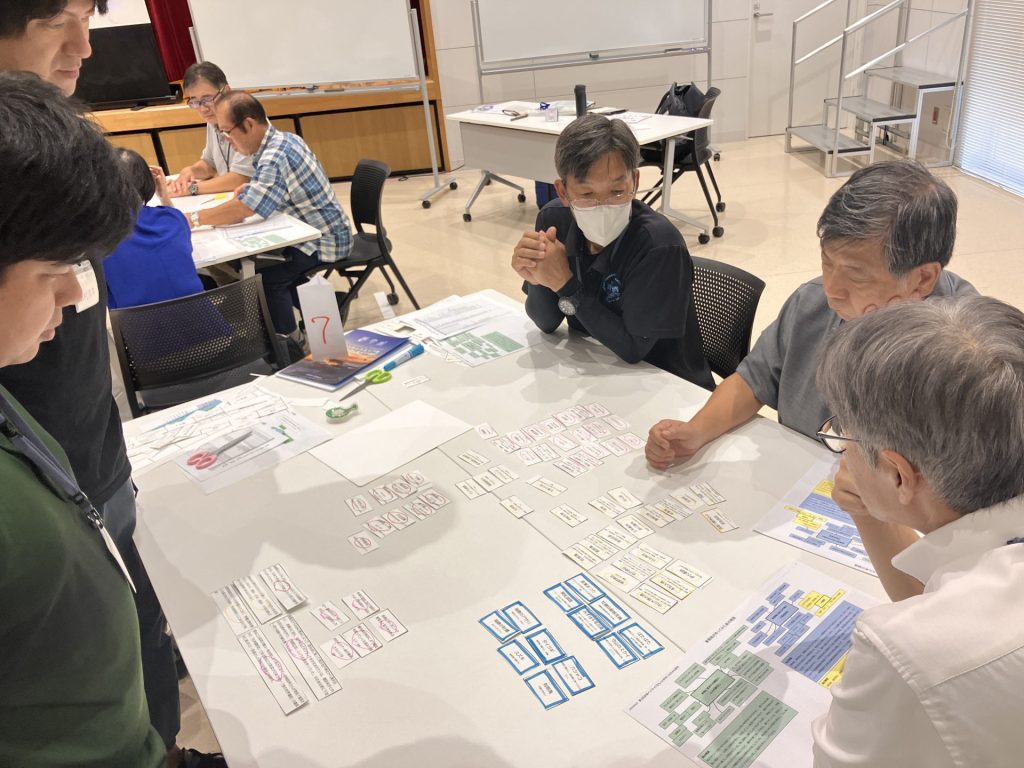 沢山の資源を「カード」にして、並べながら文章を考えるという、かなりチャレンジングな内容です。班を分けての活動が始まりましたが、これがなかなか難航!頭をひねりながら進めていきます。